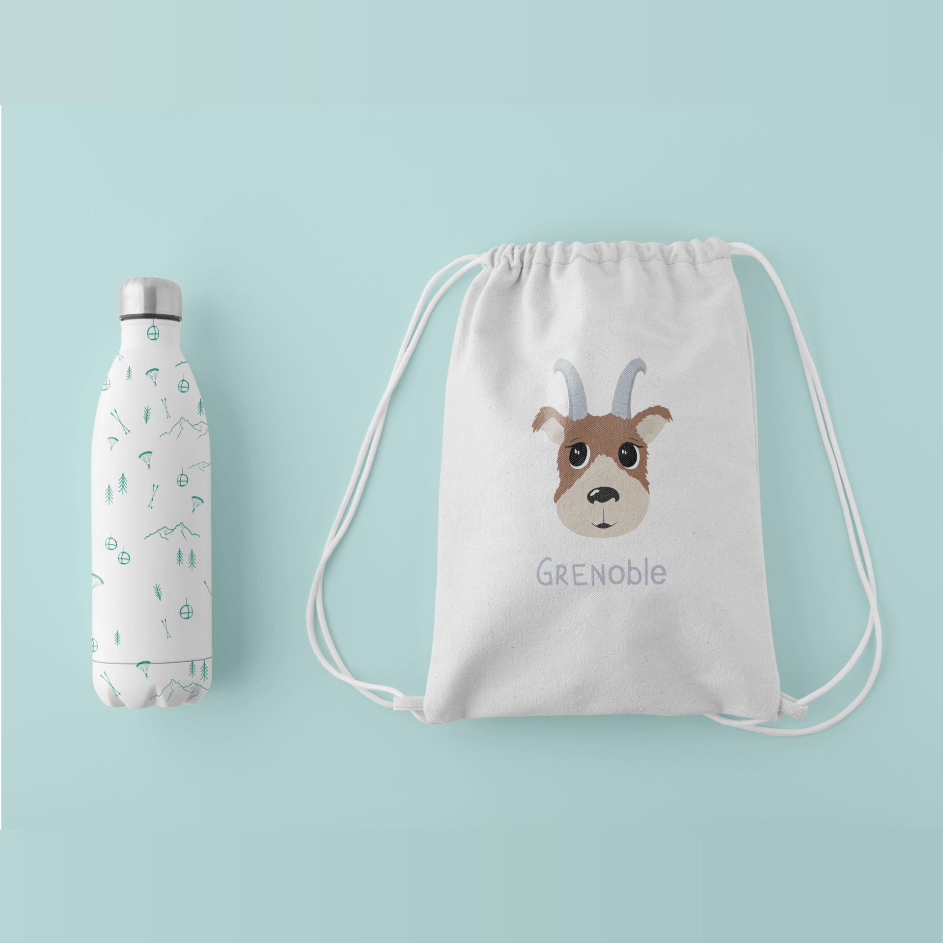 - Collection bébé : motifs qui représentent les activités de la ville (randonnée, parapente) et ses symboles (sapins, montagne, bulles) dans des couleurs douces. Deuxième version : dessin du Dahu, animal mythique de Grenoble.
